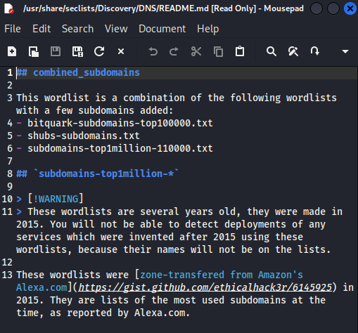 下記は ‘/usr/share/seclists/Discovery/DNS/’ に用意されているwordlistです。
